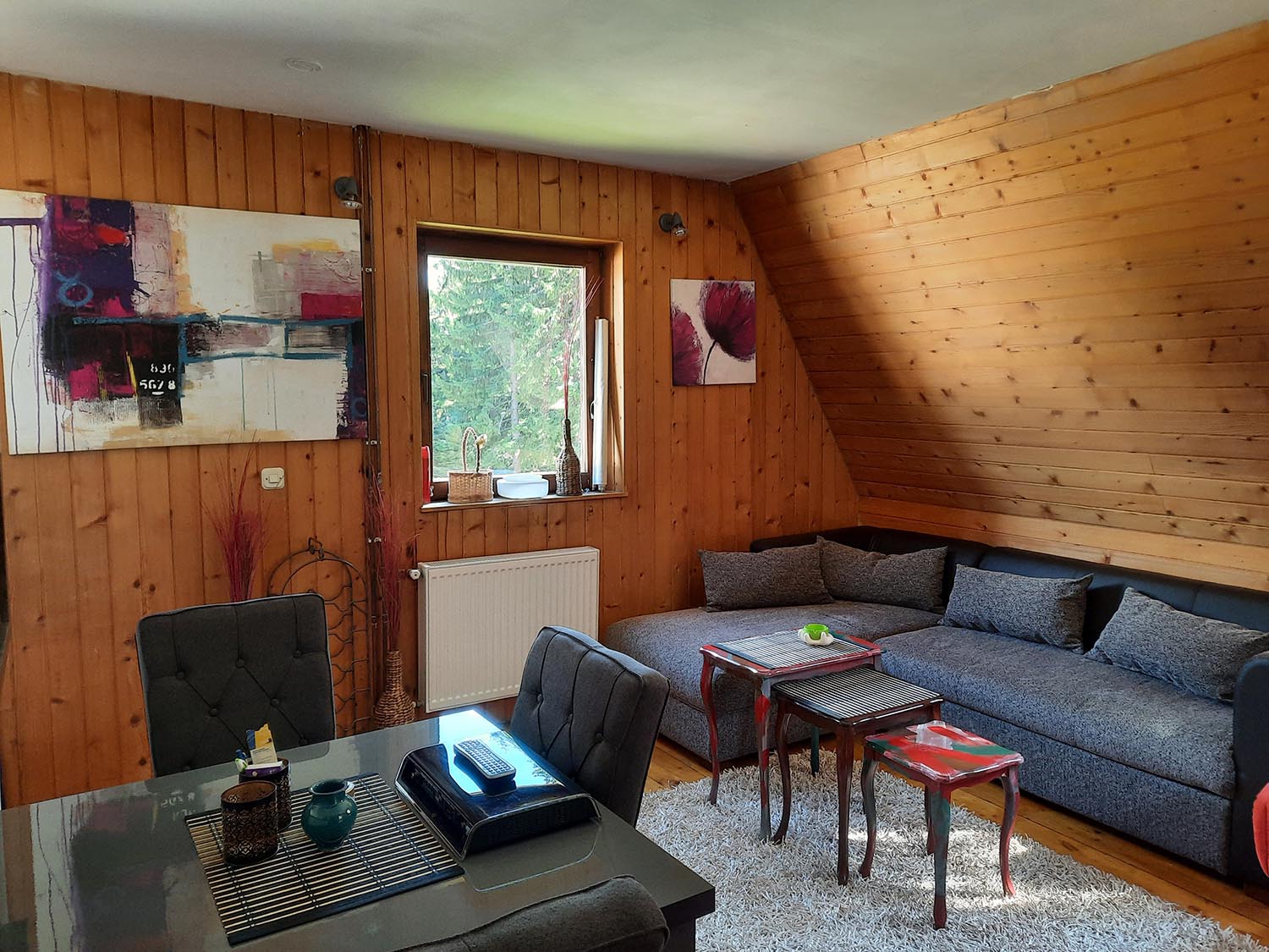 Na ulasku u kucicu je veci hodnik koji se koristi i kao skijasnica. U prizemlju kuce je dnevni boravak sa ugaonom garniturom (mogucnost spavanja dvije osobe) i kaminom, cajnom kuhinjom sa trpezarijskim stolom. Kupatilo sa tus kabinom. TV + internet.