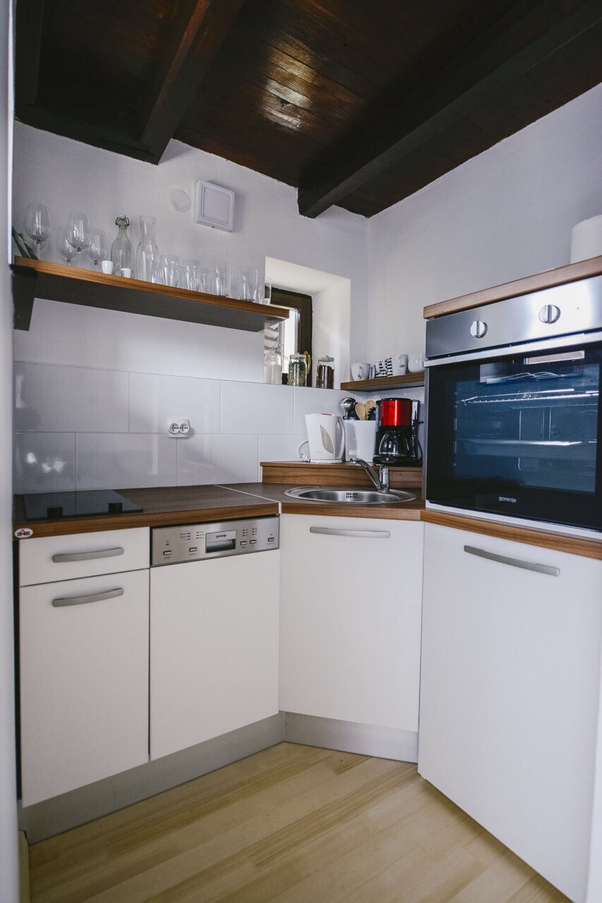 Centralna prostorija je svakako otvoreni tip dnevnog boravka sa trpezarijom. Kuhinja se nalazi u produzetku i opremljena je potrebnim inventarom za udoban broavak (masina za sudje, posudje, pecnica).